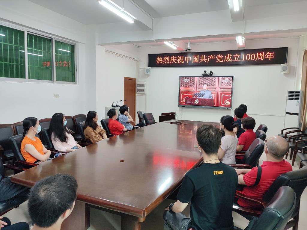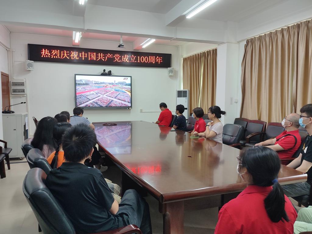 7月1日上午,科技创新中心组织师生在实验楼二楼大会议室观看庆祝中国共产党成立100周年大会在线直播。