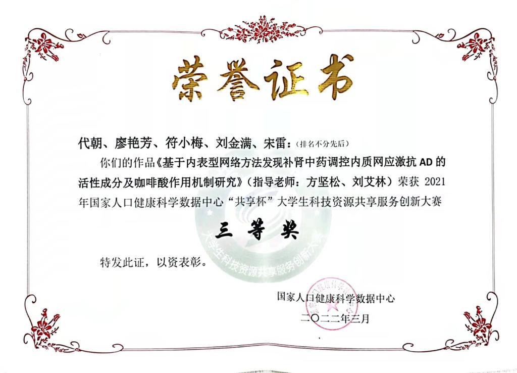 近日,2021年人口健康“共享杯”大学生科技资源共享服务创新大赛结果出炉。科技创新中心方坚松副研究员与中国医学科学院刘艾林教授共同指导,中心研究生代朝、廖艳芳、符小梅、刘金满及宋雷组成团队提交作品《基于内表型网络方法发现补肾中药调控内质网应激抗AD的活性成分及咖啡酸作用机制研究》,荣获大赛三等奖及药学专项三等奖。