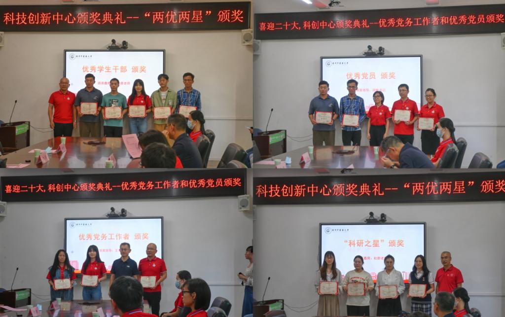 10月14日上午,科技创新中心在三元里校区实验楼二楼会议室举行“喜迎二十大,奋进新征程,建功新时代”系列活动之中心“两优两星”“优秀党员和党务工作者”“院徽入围作品及最佳作品”颁奖仪式,中心师生代表及获奖者近40人参加。