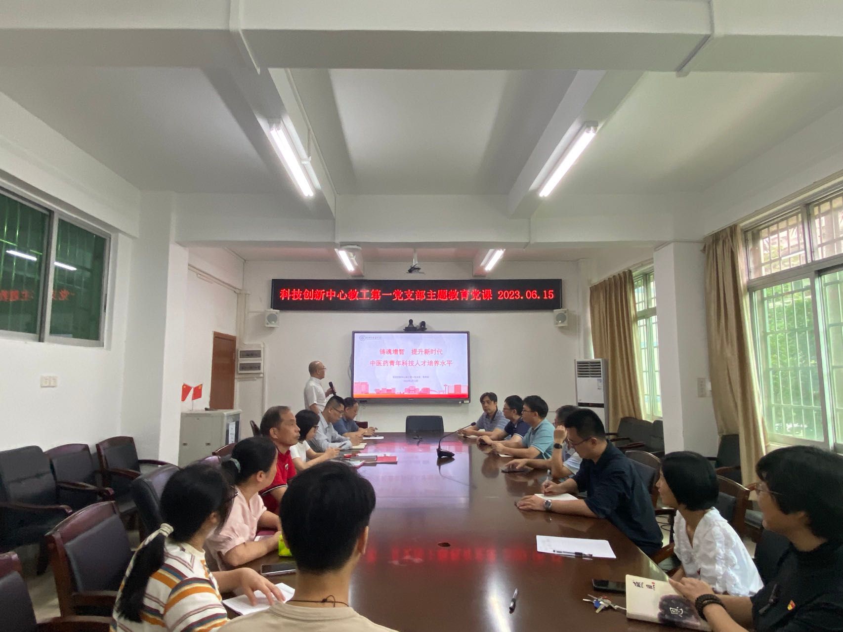 6月15日上午,科技创新中心教工第一党支部书记李伟荣在三元里校区实验楼二楼大会议室为教工第一党支部党员讲授专题党课,深入学习贯彻习近平新时代中国特色社会主义思想。