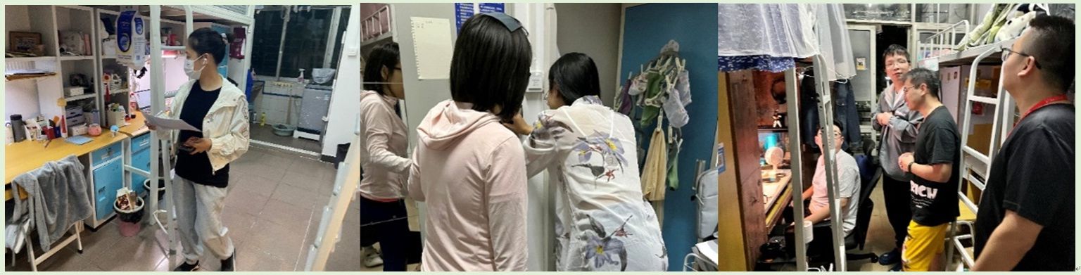 晚上8时,阎敏、梁勇、唐莹老师与团委、研究生会及班委等学生干部分组巡查中心三元里校区各年级宿舍,重点检查宿舍卫生清洁、积水情况。针对发现的问题提出整改措施:一是及时更换漏水管道,保证“不积水,不存水”;二是及时清理出现的积水情况,隔绝蚊虫滋生;三是多通风以保持空气自然流通。