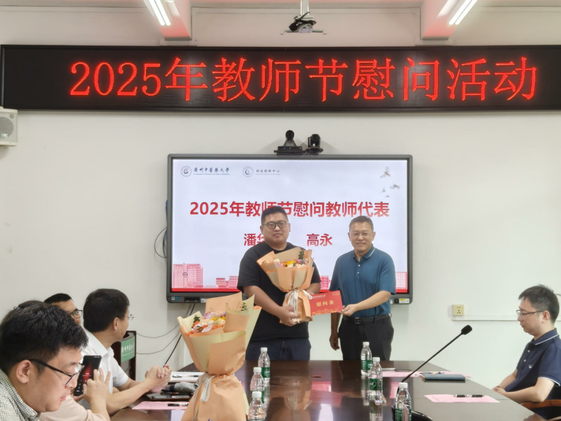 金秋送爽,硕果盈枝,9月9日上午,在第四十一个教师节即将来临之际,学校党委常委、副校长杨荣源一行来到三元里校区实验楼二楼大会议室,亲切慰问科技创新中心教师。学校原副校长、国家重点研发计划项目负责人潘华峰教授,国家青年科学基金项目(B类)(原优秀青年科学基金项目)获得者高永研究员,中心领导班子成员以及教师代表20余人参加活动。科技创新中心主任陈扬主持活动。