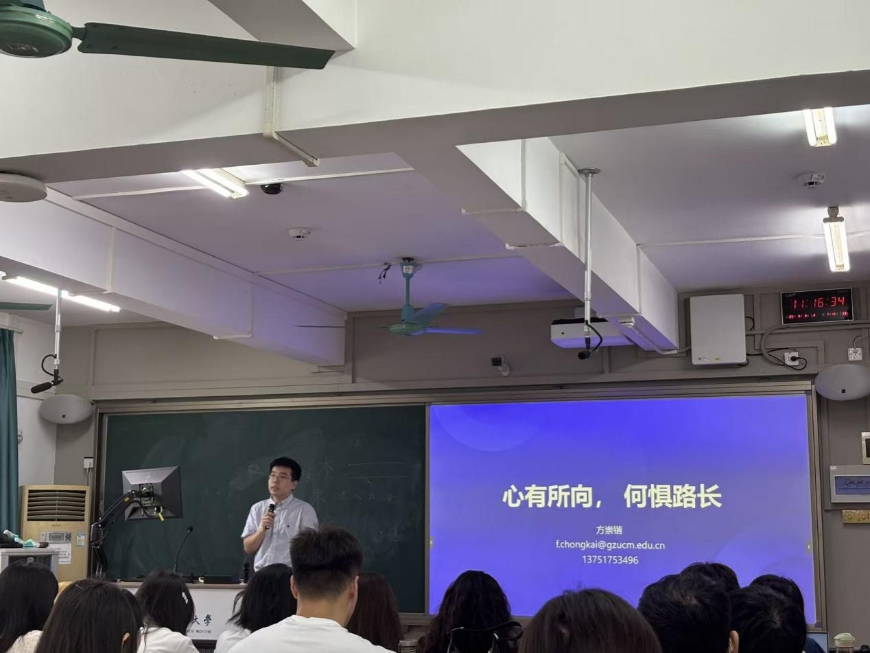 方崇锴老师以“心有所向,何惧路长”为主题,为新生们带来了一段真挚而充满力量的寄语。他结合自己的科研经历,娓娓道出坚持理想、不畏艰难的重要性,鼓励大家在学术道路和人生旅程中始终保持内心的方向感与前进的勇气。