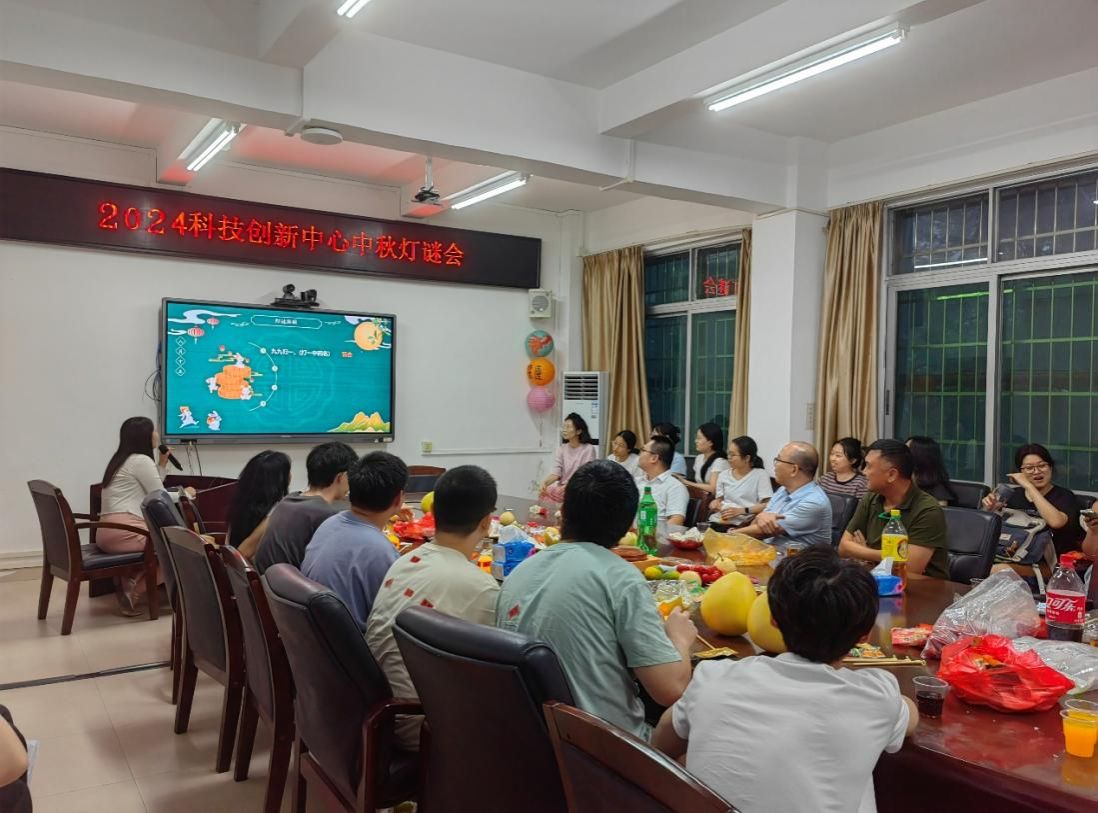 海上生明月,天涯共此时。9月13日晚上,科技创新中心在三元里校区举办“中秋灯谜会”师生文化活动。三元里校区实验楼大厅灯笼灯谜悬挂,会议室摆满水果零食和月饼,科技创新中心洋溢着浓浓的中秋氛围。中心副书记何军、副主任李伟荣、团委书记梁勇以及中心学生60余人参加。